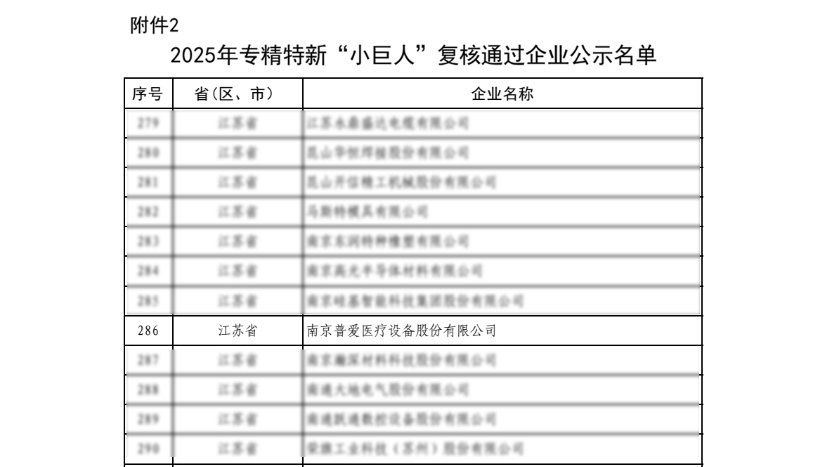 近日,工业和信息化部2025年专精特新“小巨人”企业复核结果公布,南京普爱医疗设备股份有限公司凭借22年深耕医学影像与手术机器人设备领域的技术积淀和丰硕的自主创新成果,顺利通过复审,持续保有国家专精特新“小巨人”企业荣誉称号。